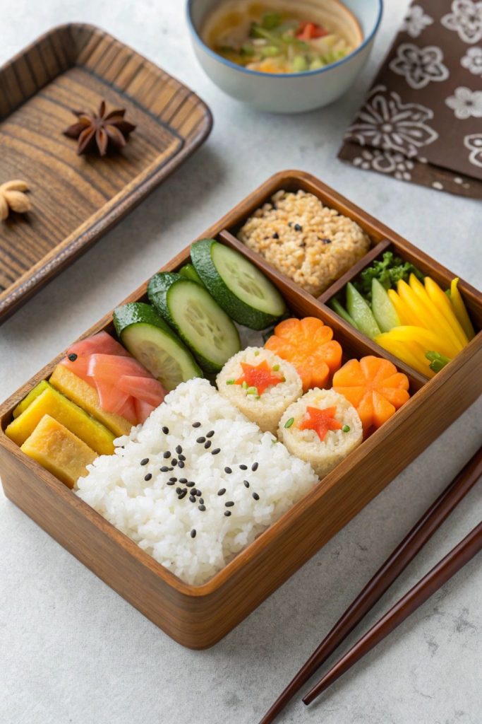 2. Ajoutez une protéine principale (poisson grillé, poulet teriyaki, ou un onigiri).